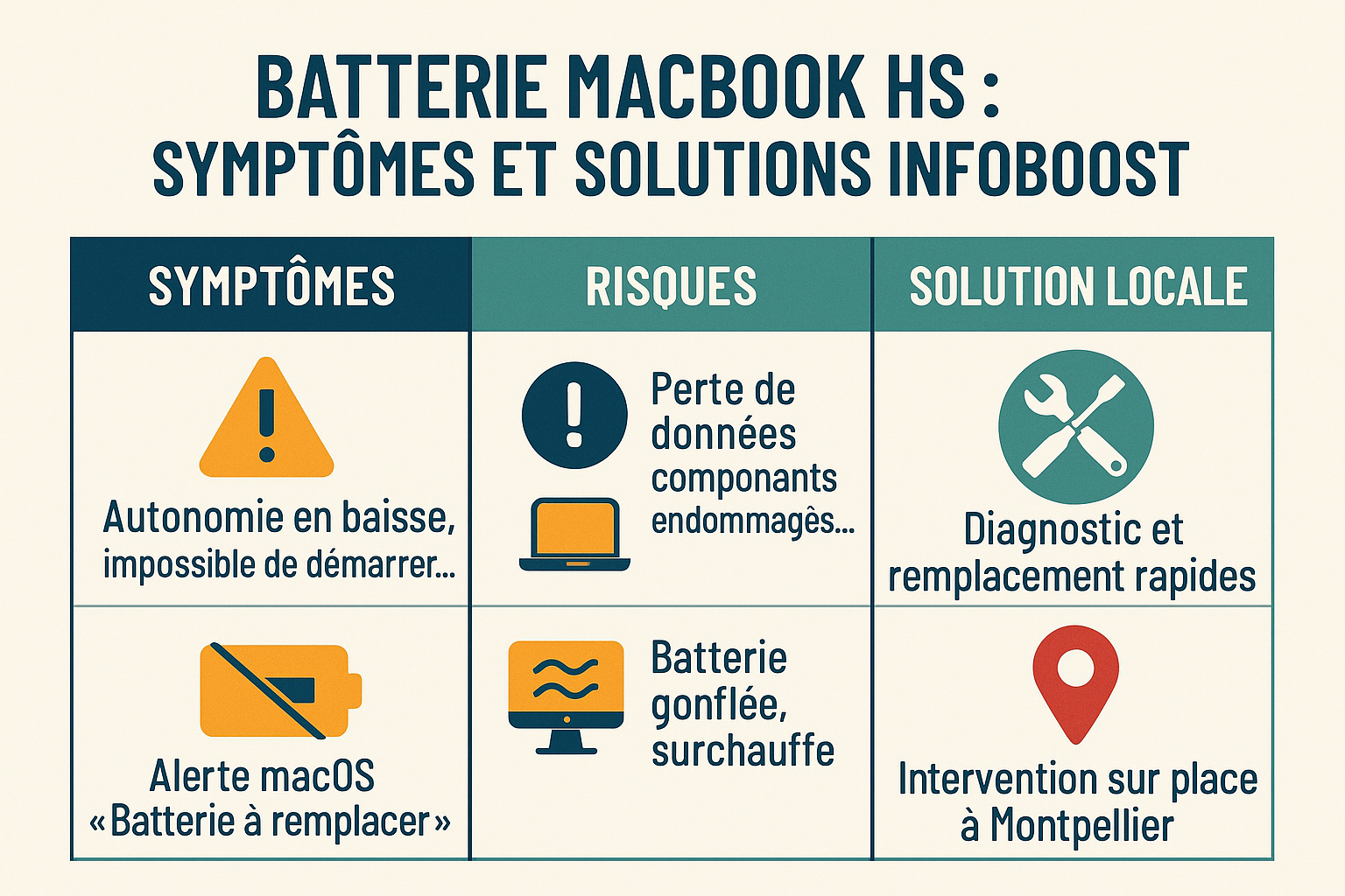 Vous avez une batterie MacBook HS à Montpellier ? Qu’il s’agisse d’un MacBook Air ou Pro, une batterie défectueuse peut rapidement perturber votre quotidien ou votre activité professionnelle. INFOBOOST, entreprise locale passionnée par la réparation informatique et le reconditionnement, vous accompagne pour diagnostiquer, remplacer et optimiser la durée de vie de votre batterie, dans le respect de vos besoins et de l’économie locale.